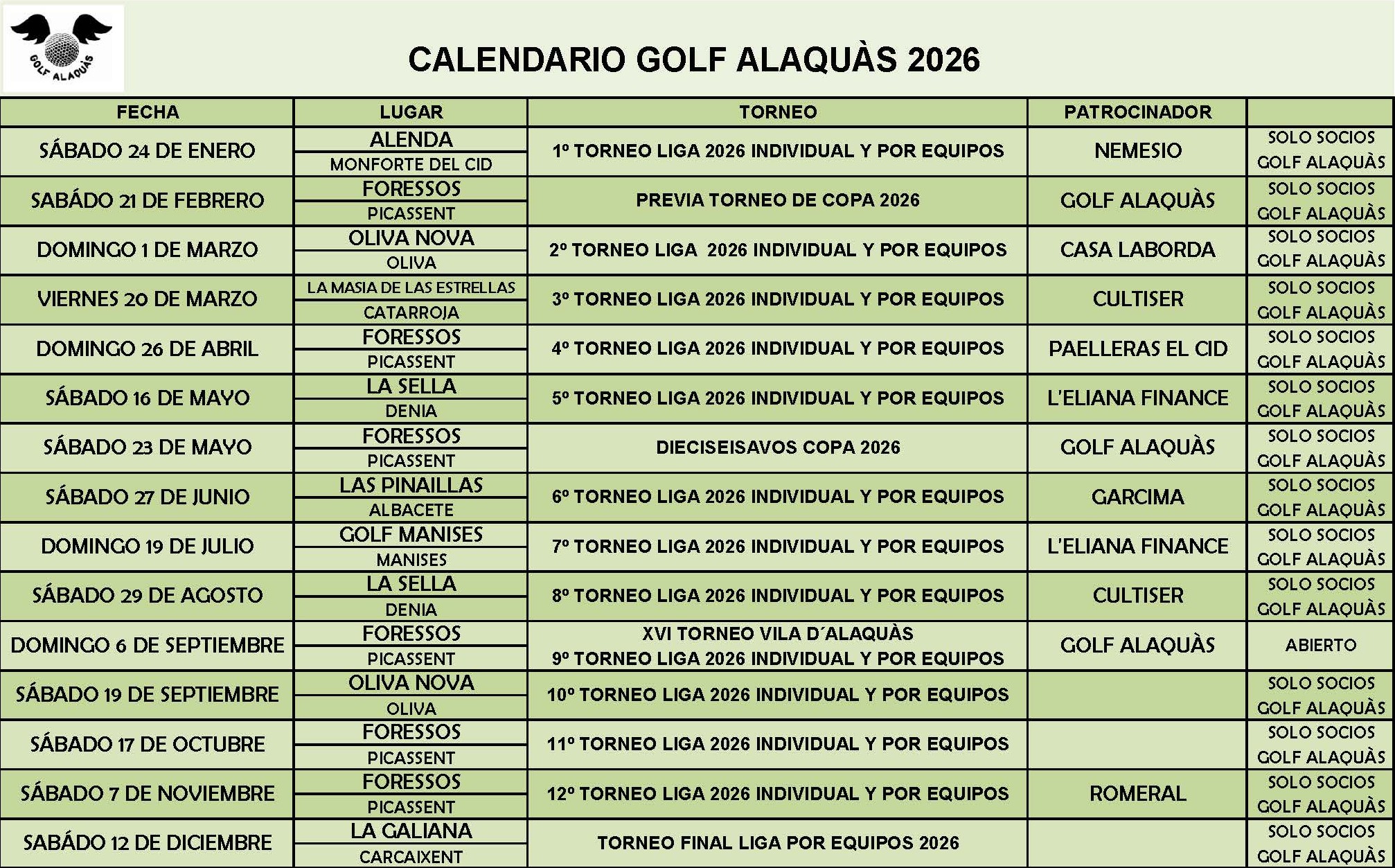 CALENDARIO GOLF ALAQUÀS 2026