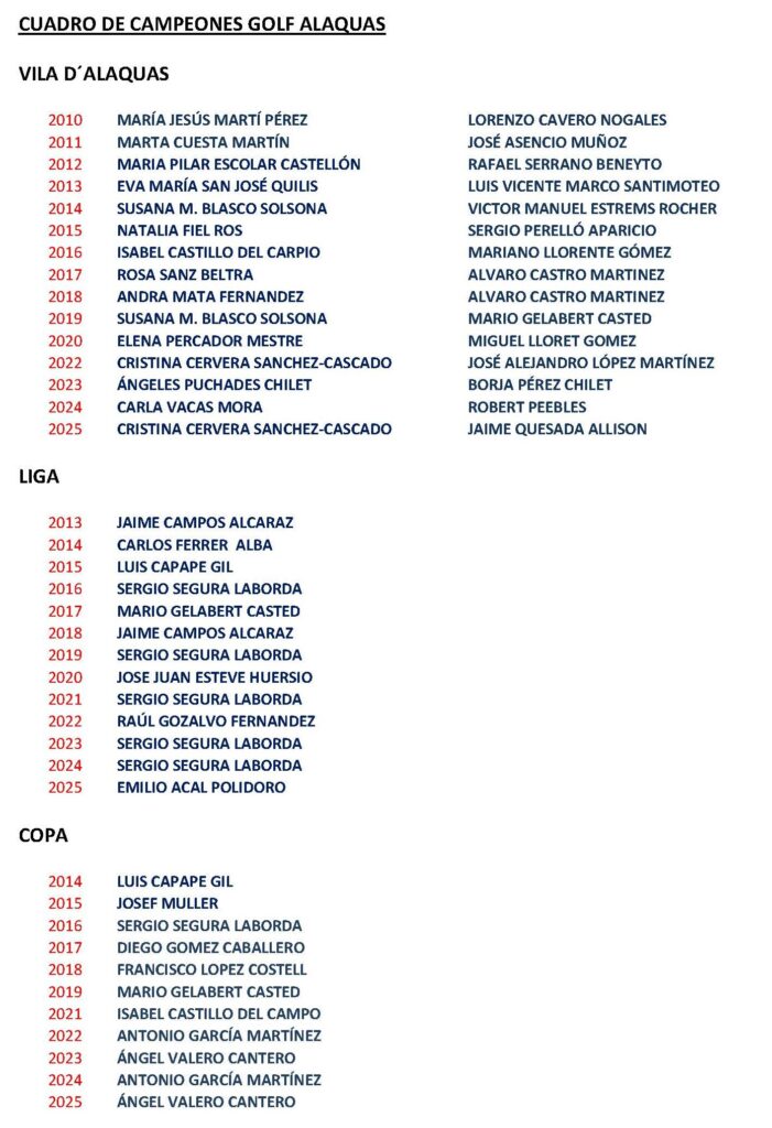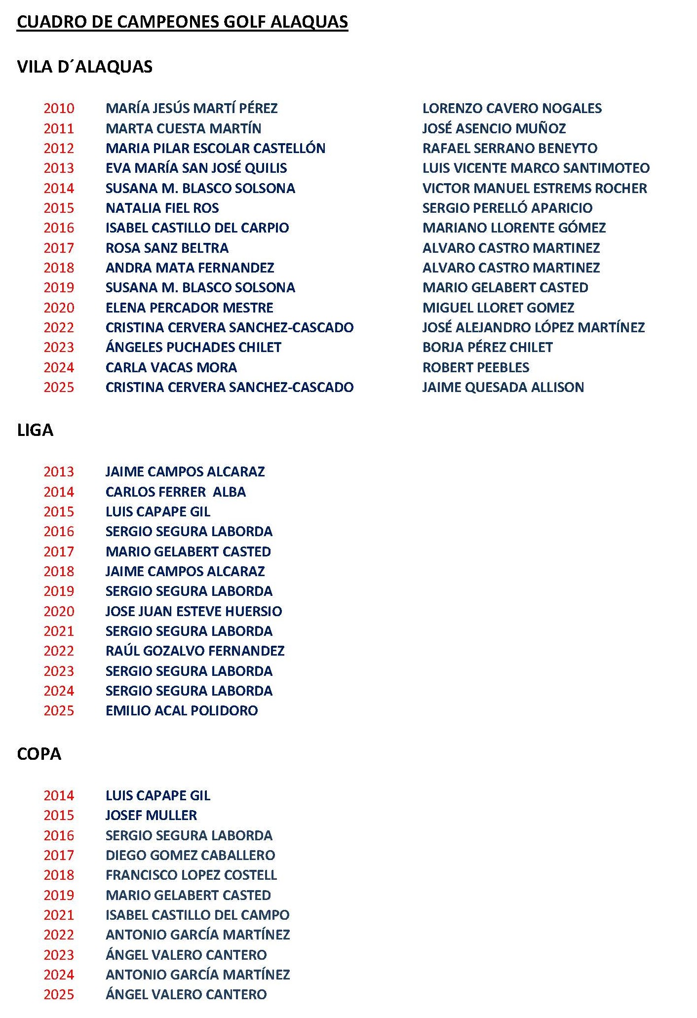 CUADRO DE CAMPEONES GOLF ALAQUÀS