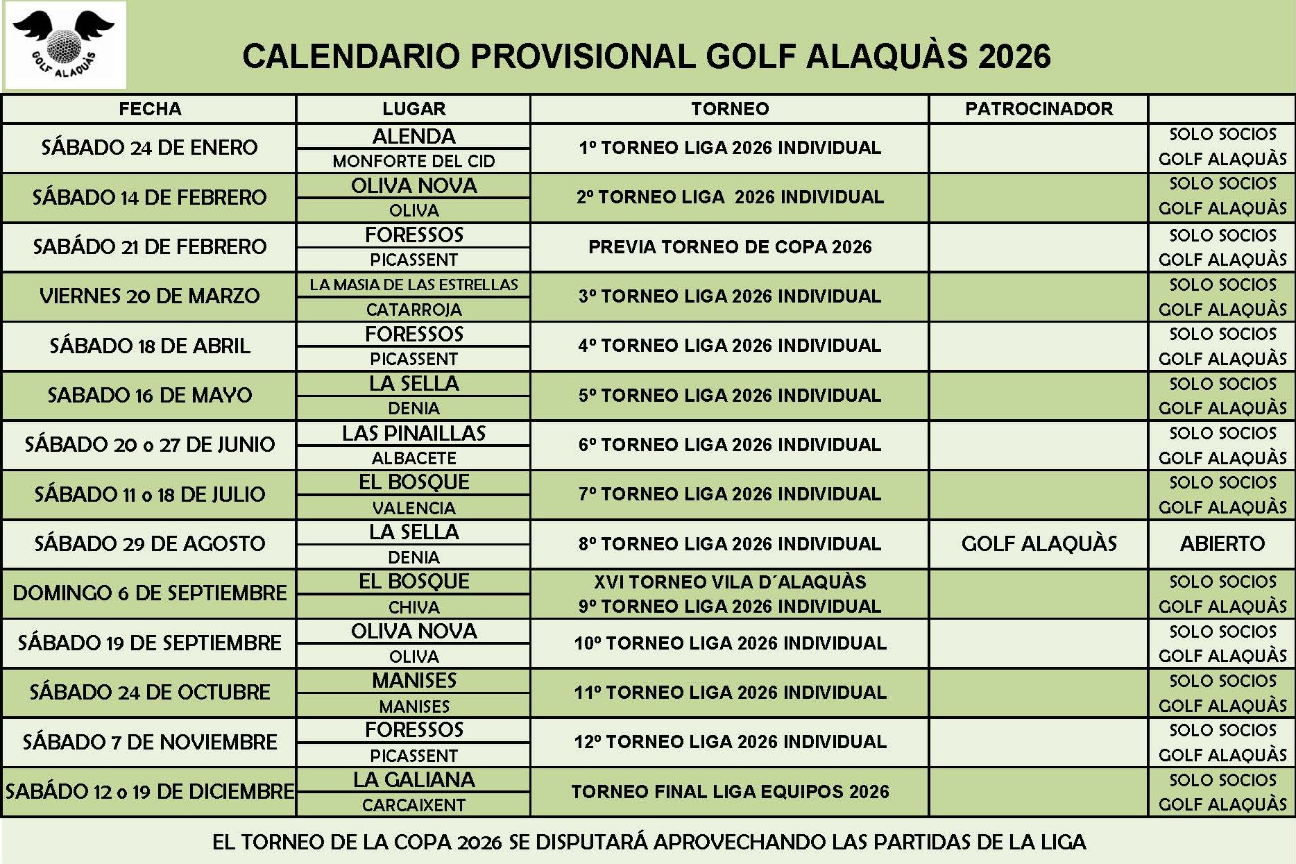 CALENDARIO PROVISIONAL GOLF ALAQUÀS 2026