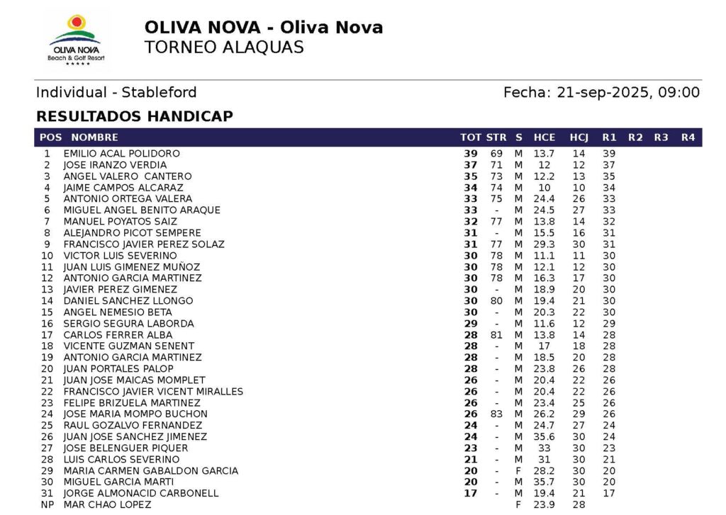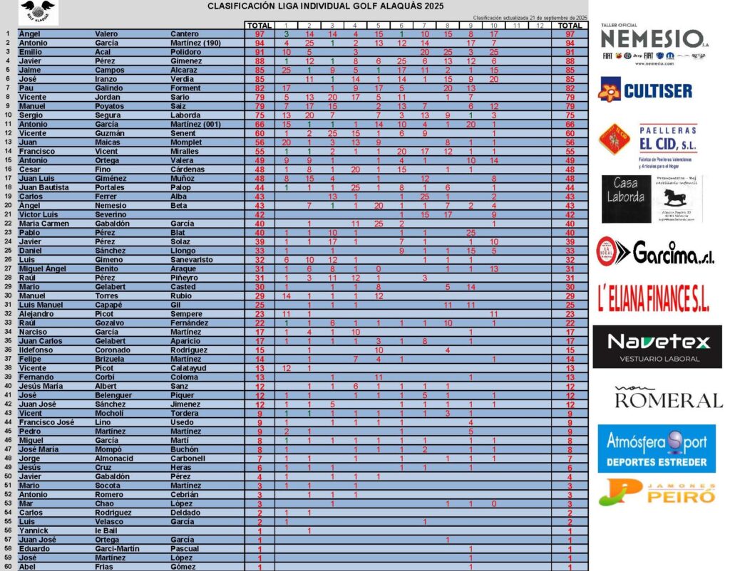 Clasificación general actializada a 21 de septiembre de 2025 (10 torneos)